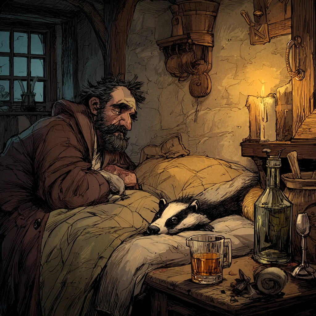 The only clue was a ragged scrap of leather around the badger’s neck, perhaps the remnant of a collar, and the broken window. Regardless of the circumstances, the badger was pissed and dealt Bancroft a nasty bite. He fled out of the room, naked, with only his sword, gasping a quick prayer for healing. The badger pursued, chewing the door to bits. Bancroft fled again to the inn’s common room, praying once more that Sylvanus would ease the badger’s wrath.