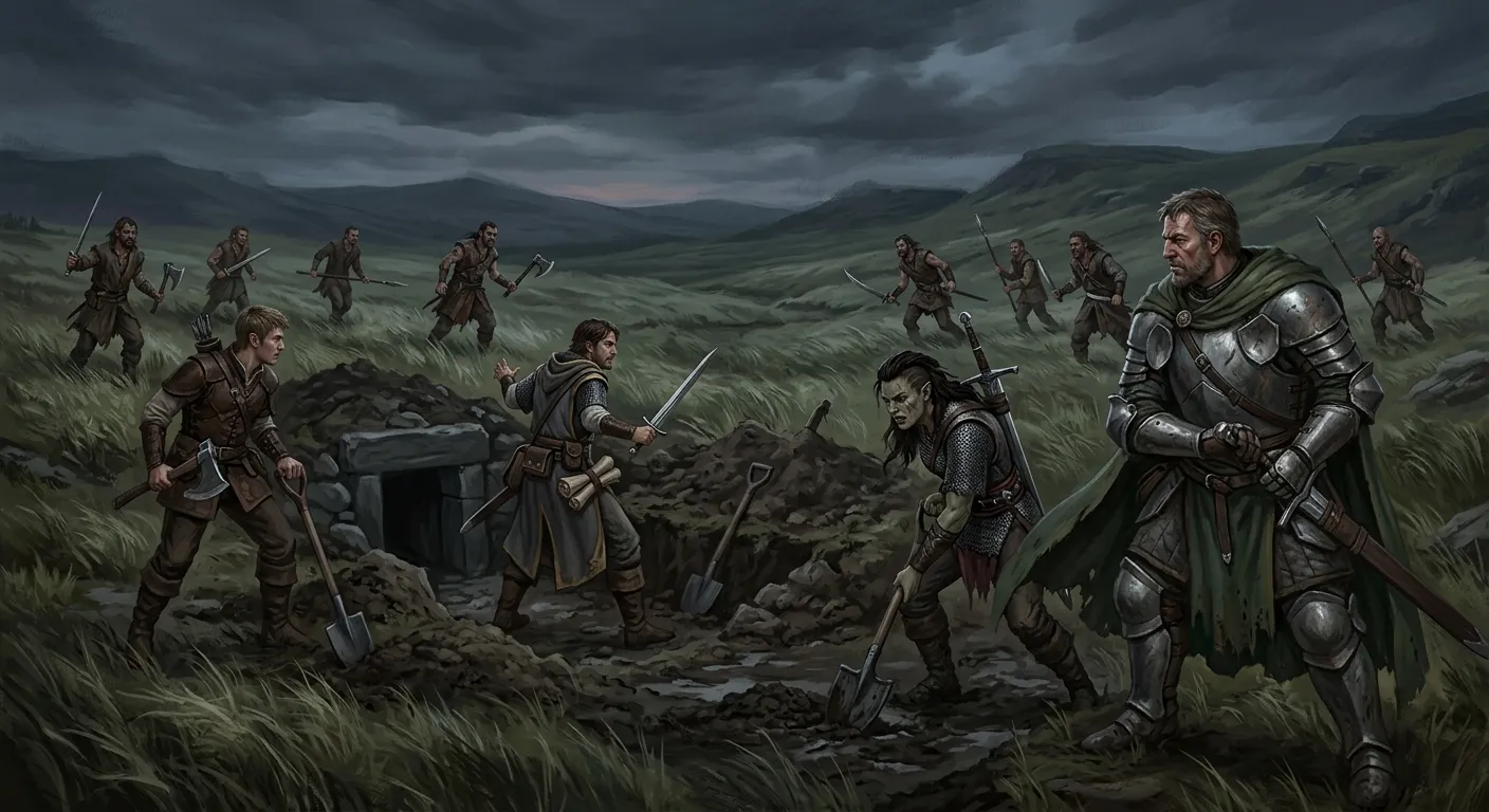 Nine figures, coming across the moor from the east. Not the Boon Companions — these moved differently. Spread out. Quiet. The way people move when they’ve already decided what they’re going to do and conversation isn’t part of it.