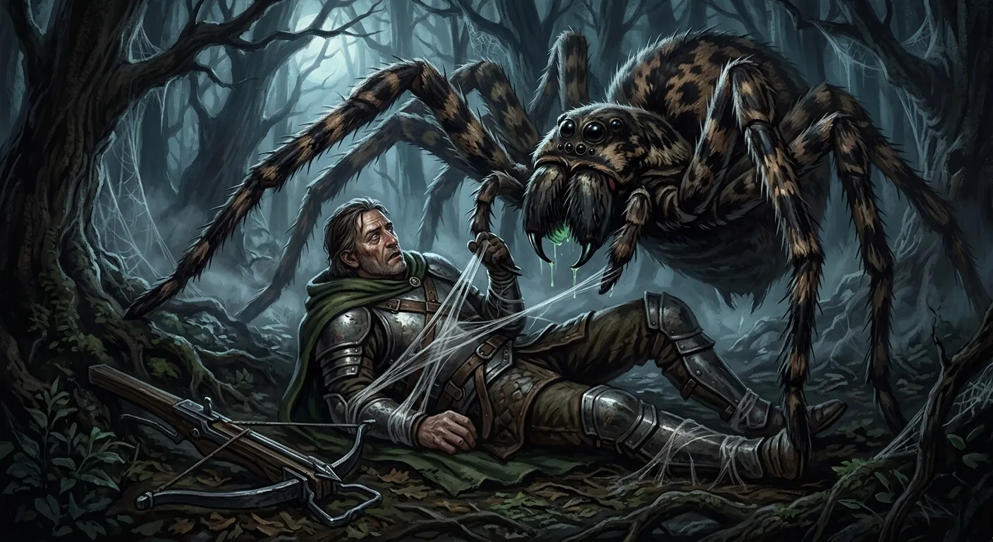 It was faster than him. His shield was on his back because he’d had the crossbow out, and the spider found the gap like it knew it was there. One bite, quick and surgical, two points of pressure on the side of his neck. The pain was small. A pinch. Nothing.