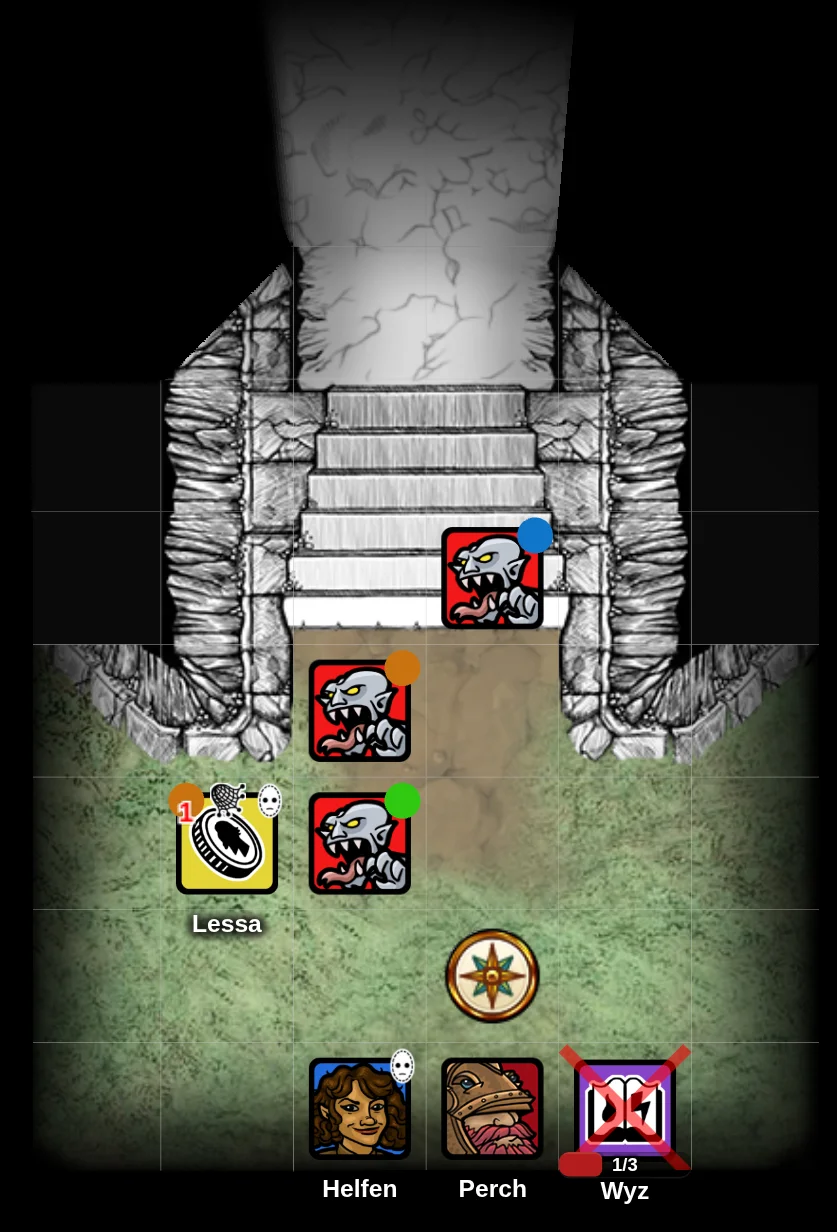 Wyz grumbled and groaned. His minions refused to obey him and return to the tomb with the tome. They insisted on opening a new barrow! And of course it was filled with ghouls hiding behind a tapestry. The undead creatures swarmed, striking Lessa and Wyz. Perch blocked the blow with his shield, but the creatures ripped it off of his arm. Wyz fell unconscious, and Lessa just stared into space, paralyzed with horror. Perch grabbed Wyz and fled with his unconscious body, leaving Lessa with a frozen look of horror on her face. After a moment the small halfling vanished from sight, confusing the ghouls, but they quickly followed the rest of the group.