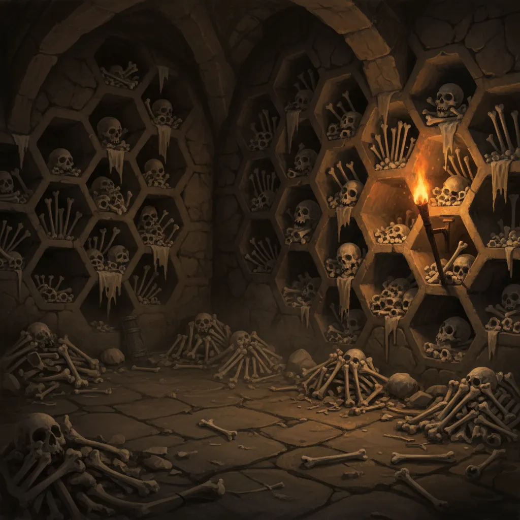 The barrel tomb room, alcoves full of gnawed bones, torchlight casting long shadows