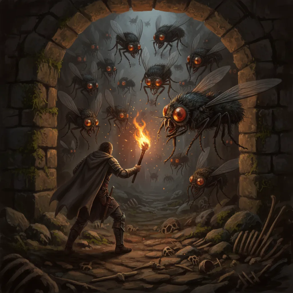Giant flies swarming toward torchlight in the barrow corridor