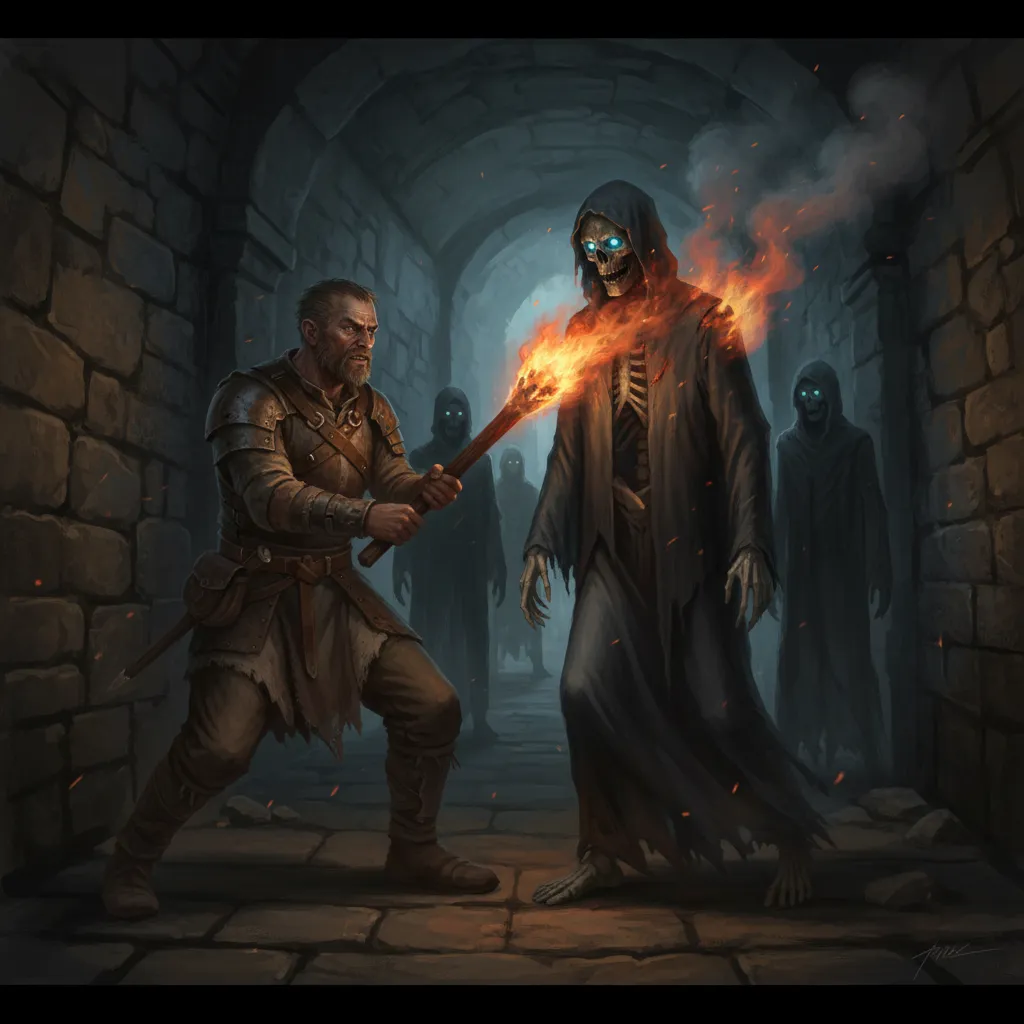 Vorn drives a torch into a robed skeleton in a dark corridor
