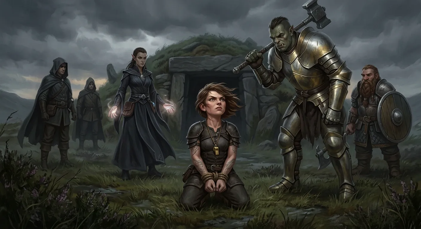 Five of them, coming over the rise from the west – five that Bancroft could see, anyway. The leader was a half-orc the size of a small barn, plate mail polished to a hard shine, a warhammer at his hip and a holy symbol on his chest that Bancroft recognized after a moment as belonging to Krom. A dwarven fighter walked at his right shoulder. An elven woman in spell-robes walked at his left. Behind them, two men with the deliberate quietness that Bancroft had learned to read – henchmen, Irulan said under her breath, and the kind that don’t carry your bags.