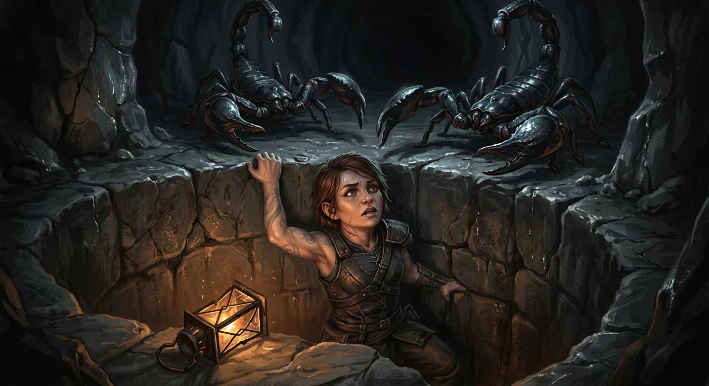 She had fallen, and at the last possible second something – the small mercy she’d been hoarding, the one favor she’d been saving for a worse moment – had caught her hand on the lip of the stone. She’d hung there. She’d been about to climb. The noise of the fall had reached down whatever was on the other side of the dark, and what was on the other side of the dark had been giant scorpions, and they had come fast.