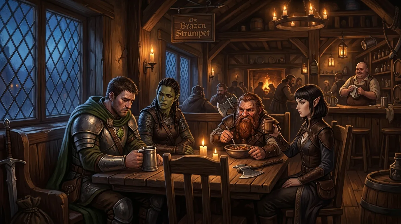Bancroft, Anister, and the new elven thief Clarice sit around a booth at the Brazen Strumpet at evening, firelight on dark wood, an empty halfling-sized gap left at the table where Riyou used to sit
