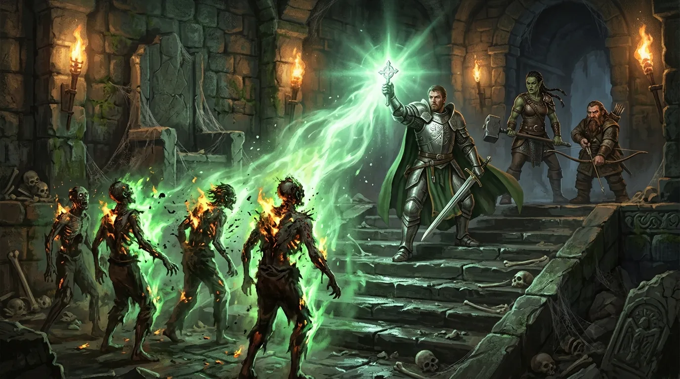 Bancroft the cleric stands at the head of a ruined crypt staircase with his holy symbol raised, a torrent of green divine fire pouring from it and consuming five shambling zombies, Anister watching from behind with his bow